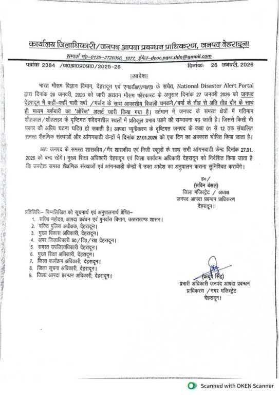 अतः जनपद के समस्त शासकीय / गैर शासकीय एवं निजी स्कूलों के साथ सभी आंगनबाडी केन्द्र दिनांक 27.01. 2026 को बन्द रहेंगे। मुख्य शिक्षा अधिकारी देहरादून एवं जिला कार्यकम अधिकारी देहरादून को निर्देशित किया जाता है कि उपरोक्त समस्त शैक्षणिक संस्थाओं एवं आंगनबाड़ी केन्द्रों में उक्त आदेश का अनुपालन कराना सुनिश्चित करायेंगे